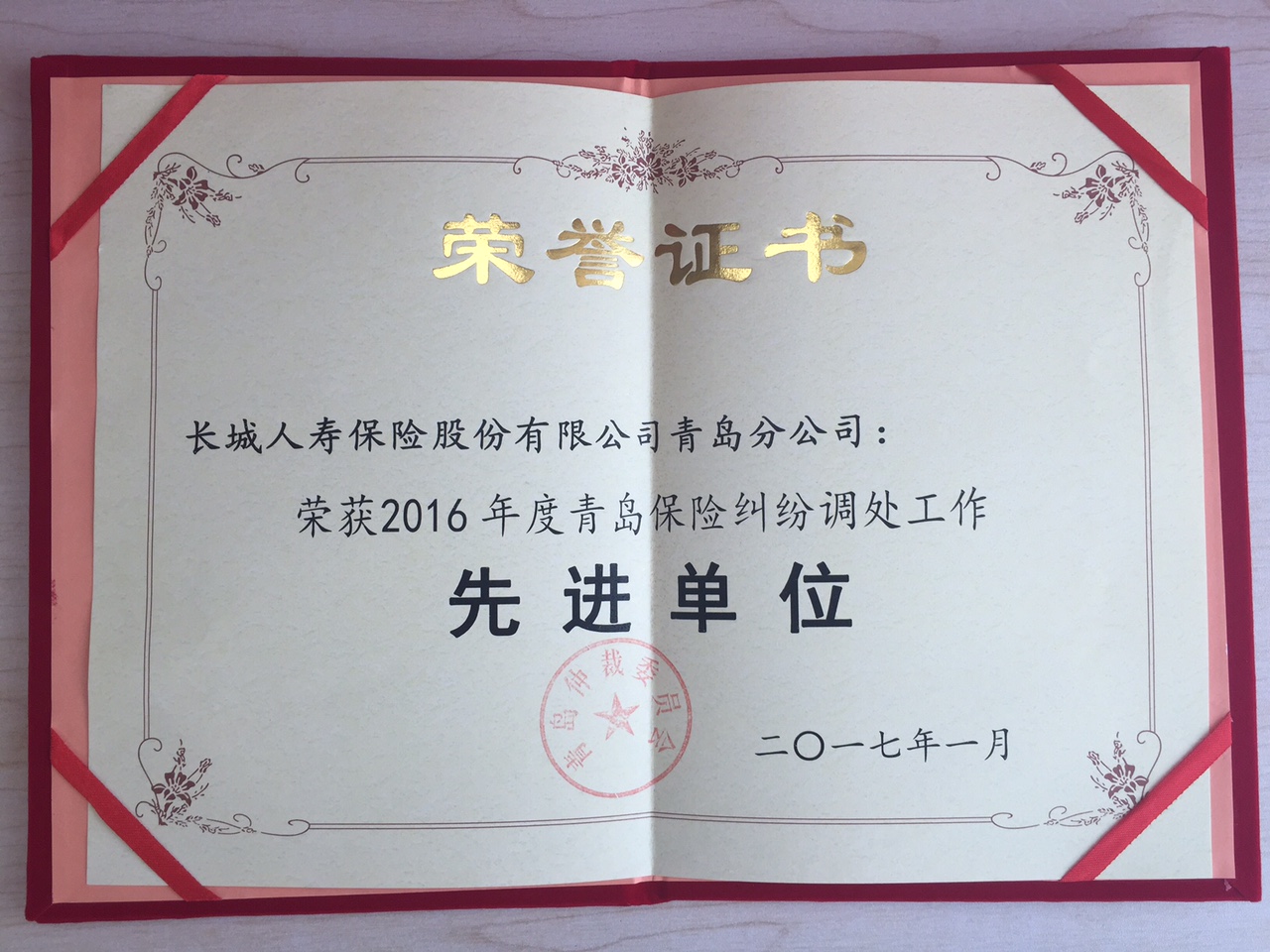 青岛分公司荣获2016年度青岛保险纠纷调处工作先进单位